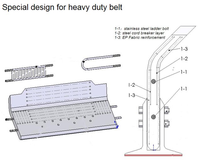 Depending on customers’ request, our sidewalls and cleats can be reinforced with diagonal fabric and bolted together. We normally use XE-layer reinforcement; However metal breaker with cross rigid character can also be applied in various specifications. We offer a?large portfolio of possible combinations of cleats and sidewalls in height up to 500mm.